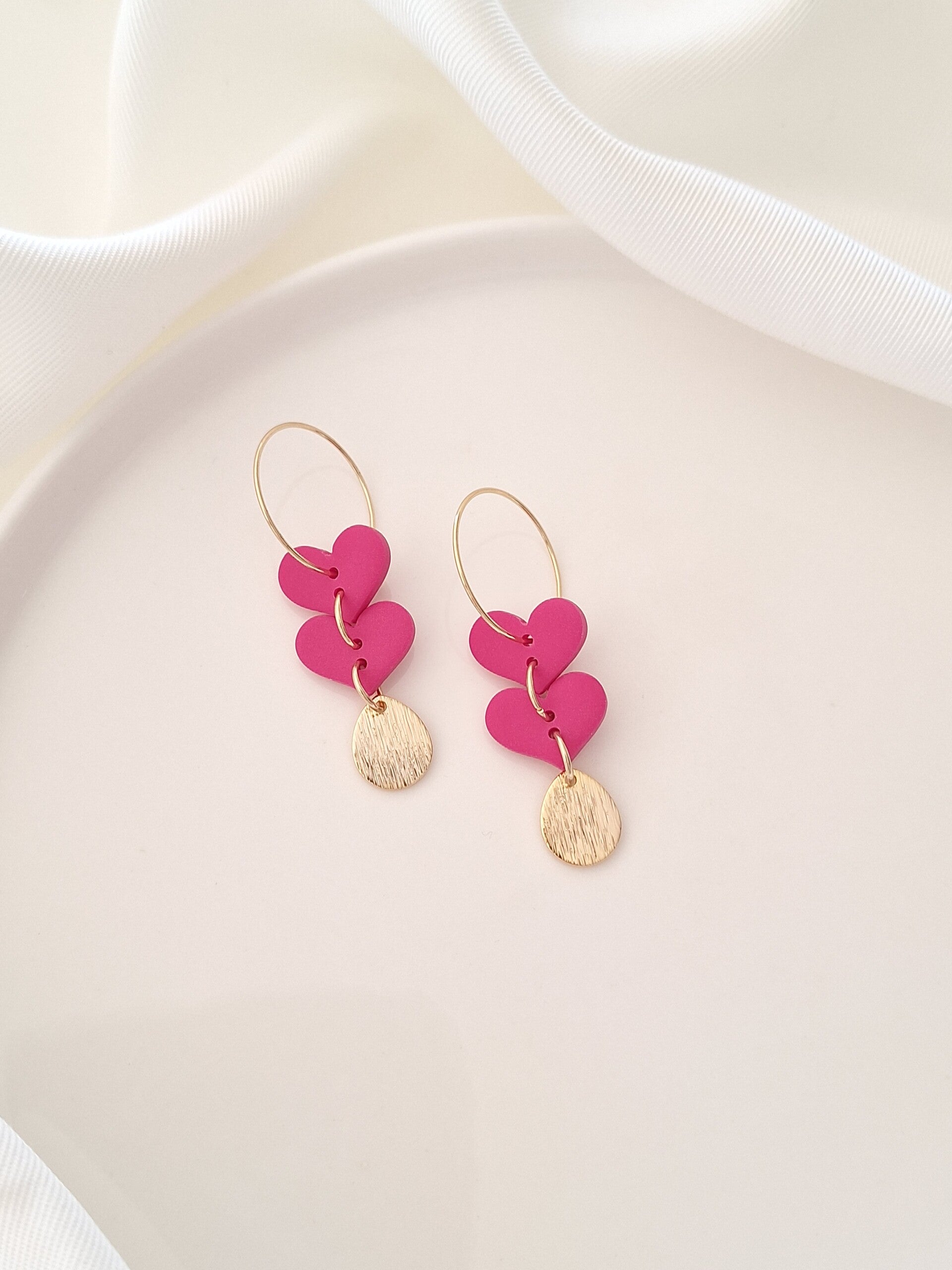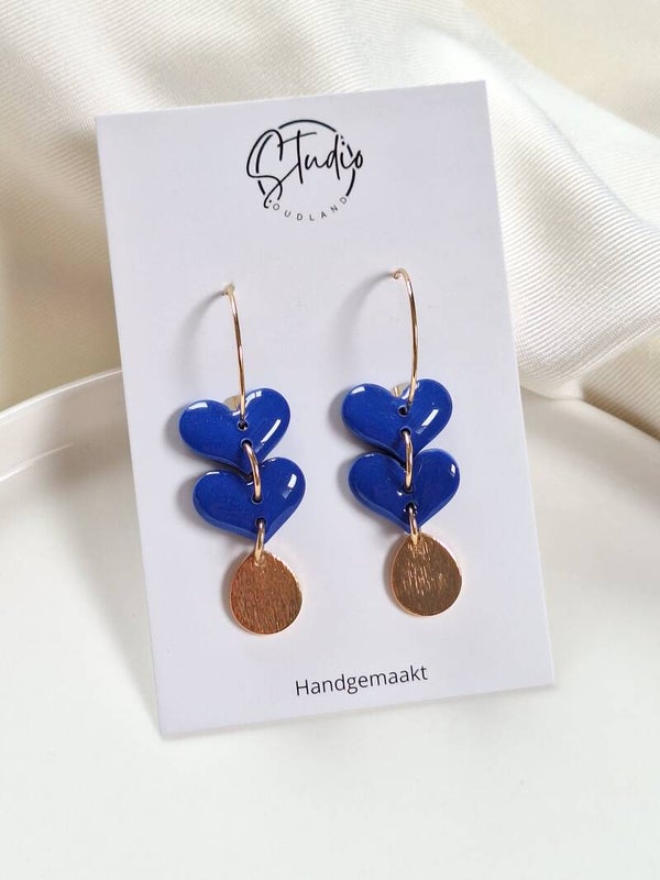 Deze oorbellen met hartjes, gemaakt van polymeerklei, zijn licht van gewicht en comfortabel om te dragen. De goudkleurige bedel aan de onderkant geeft een stijlvolle en speelse touch. Verkrijgbaar in diverse kleuren, perfect voor elke gelegenheid.