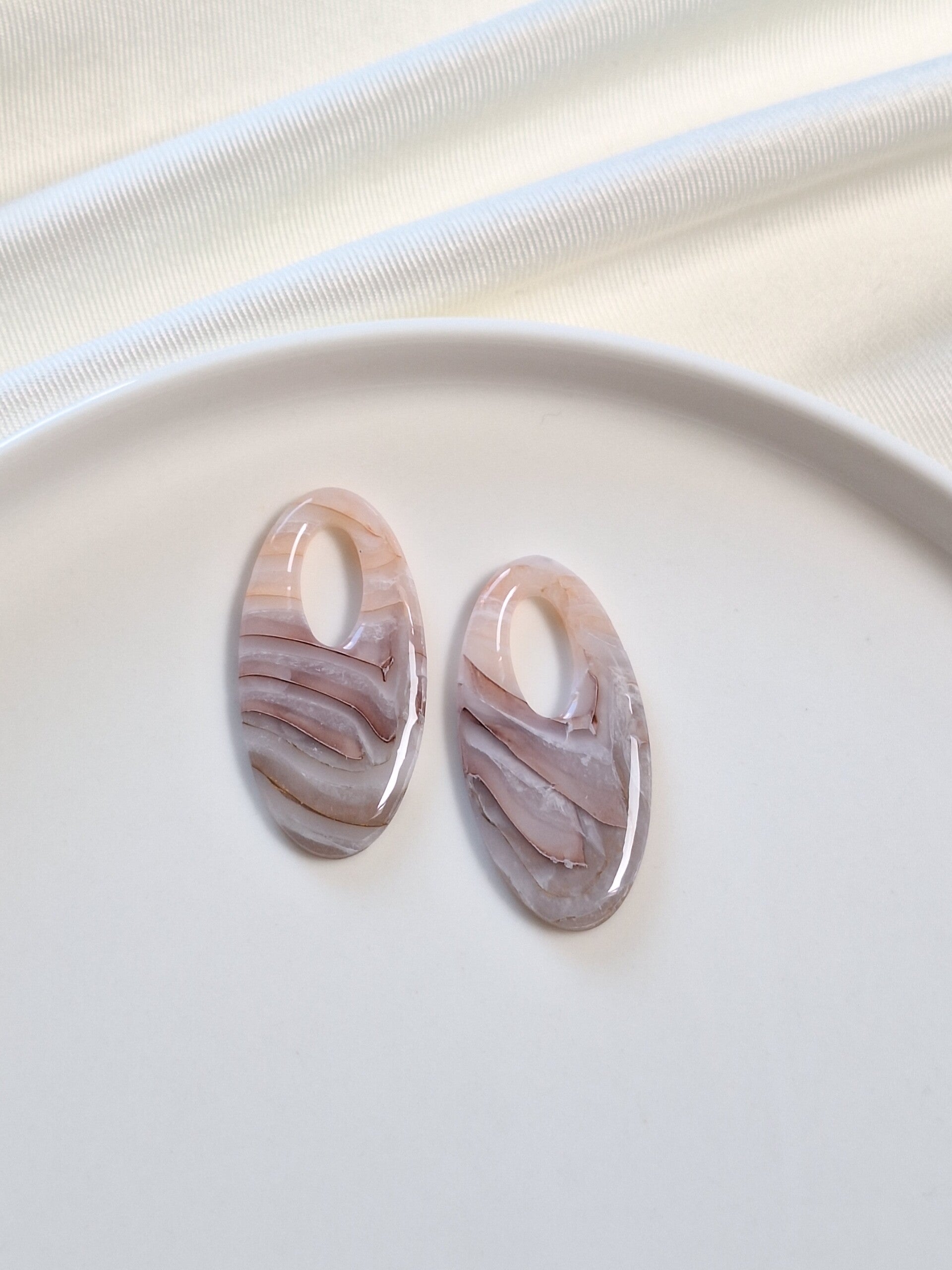 Deze bedels zijn gemaakt van transparante polymeerklei en zijn voorzien van een glanslaagje. Door het gebruik van transparante polymeerklei krijgen deze oorbellen een speels effect; afhankelijk van het licht veranderen ze subtiel van kleur, wat zorgt voor een unieke uitstraling.