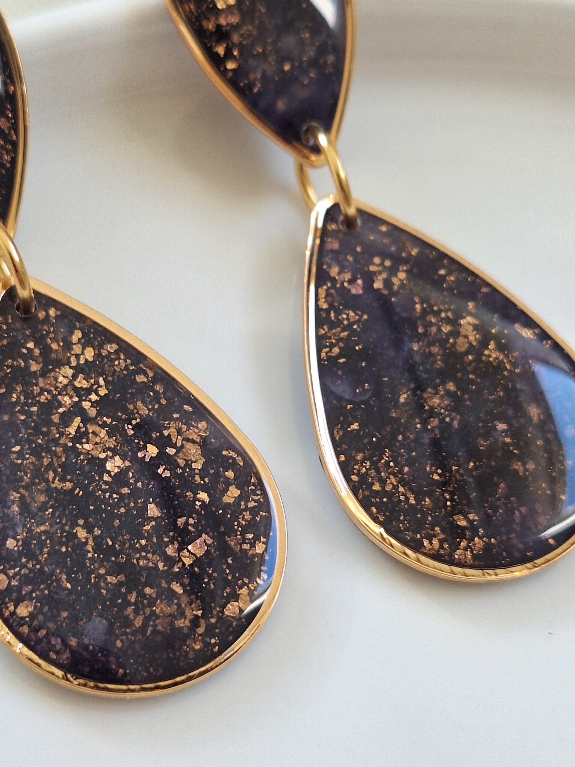 Deze zwarte/paarse oorbellen zijn gemaakt van transparante polymeerklei en zijn voorzien van een glanslaagje. Door het gebruik van transparante polymeerklei krijgen deze oorbellen een speels effect; afhankelijk van het licht veranderen ze subtiel van kleur, wat zorgt voor een unieke uitstraling.